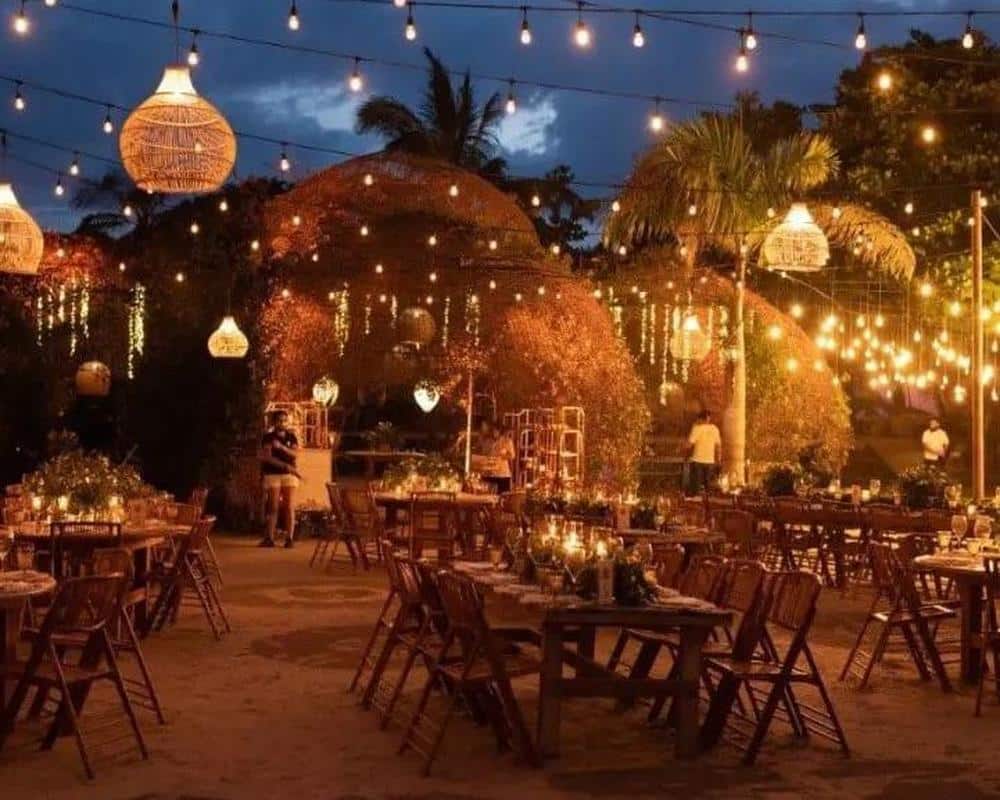 Desde el instante en que llegas, el ambiente te envuelve. La suave brisa marina, el sonido de las olas, la iluminación cálida de las antorchas y el reflejo de la luna sobre el mar crean el escenario perfecto para una noche romántica, elegante y llena de magia.