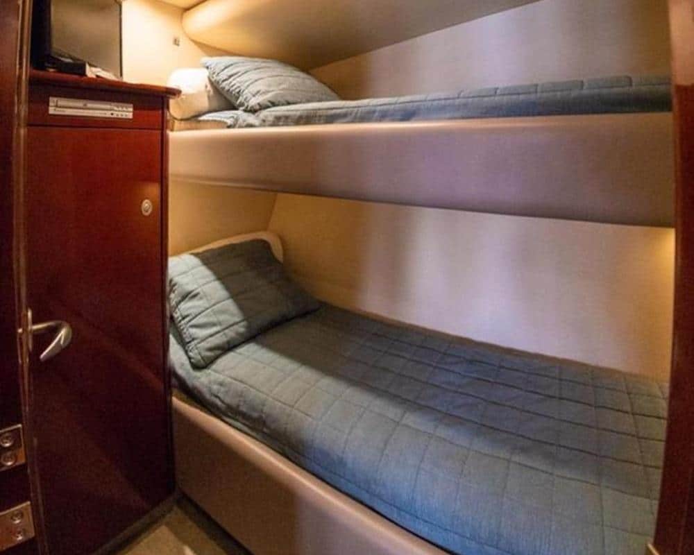 Con capacidad para hasta 18 pasajeros, el yate ha sido diseñado para que cada persona disfrute de amplitud y privacidad. En su interior, dispone de tres cuartos amplios que permiten alojar cómodamente a los invitados, así como dos baños completos, garantizando comodidad incluso en jornadas completas de navegación.
